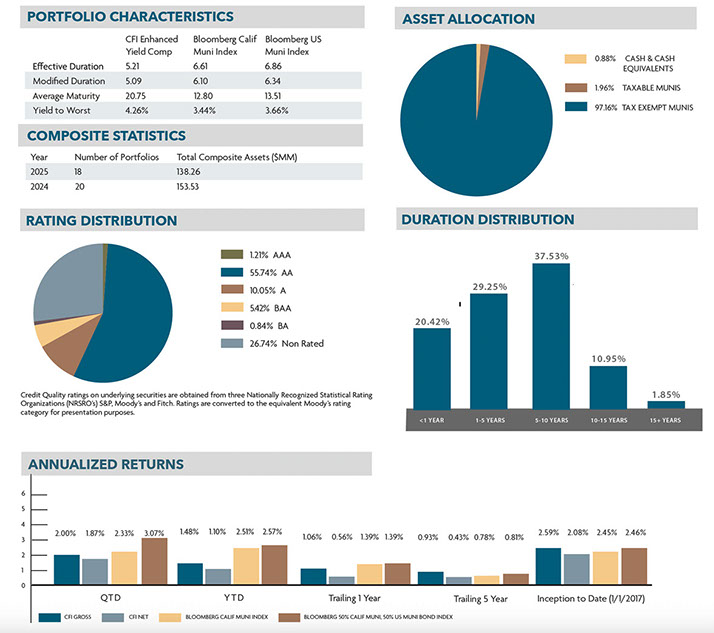 The CFI Enhanced Yield Muni Bond Composite inception date was January 1, 2017. Prior to September 2022, the composite was known as the CFI Muni Bond Composite. The composite consists of portfolios invested in broadly diversified municipal bonds, primarily of California tax-exempt issues. The strategy’s total return approach results in a broad range of durations and embedded options, driving enhanced yield potential. The portfolio management team utilizes fundamental credit analysis and sophisticated trading capability to identify and secure superior results. The strategy does not employ leverage. Performance prior to July 31, 2020 represents the track record achieved at a prior firm, and meets the portability guidelines of GIPS. The firm maintains a list of composite descriptions, which is available upon request.