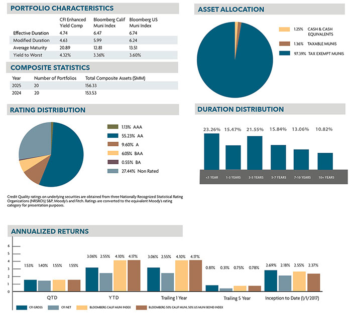 The CFI Enhanced Yield Muni Bond Composite inception date was January 1, 2017. Prior to September 2022, the composite was known as the CFI Muni Bond Composite. The composite consists of portfolios invested in broadly diversified municipal bonds, primarily of California tax-exempt issues. The strategy’s total return approach results in a broad range of durations and embedded options, driving enhanced yield potential. The portfolio management team utilizes fundamental credit analysis and sophisticated trading capability to identify and secure superior results. The strategy does not employ leverage. Performance prior to July 31, 2020 represents the track record achieved at a prior firm, and meets the portability guidelines of GIPS. The firm maintains a list of composite descriptions, which is available upon request.